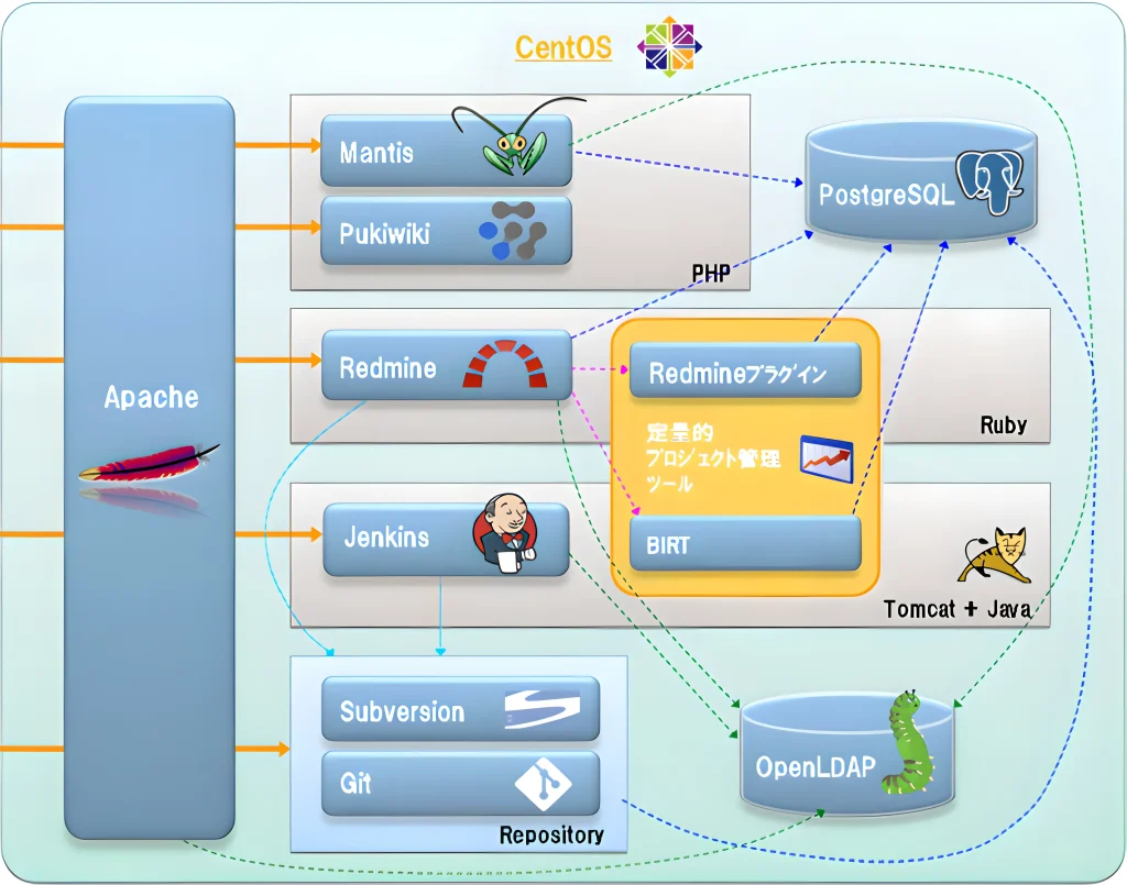 開発管理基盤として、課題管理、リソース管理などのオープンソースソフトウエアと定量的プロジェクト管理ツールを組み合わせたプロジェクト見える化ツールの開発に取り組んでいます。